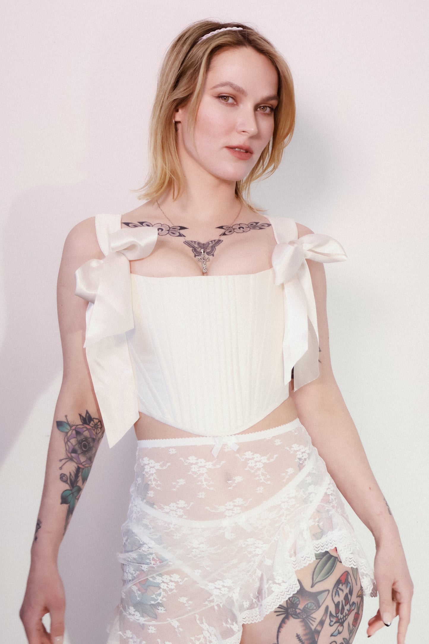A modern silk taffeta corset in repurposed off white dupion silk, inspired by the shape of Elizabethan era stays. The perfect piece to live out your romantic dreams. Lined in soft organic cotton, fully boned, and laced at the back with over the shoulder straps.