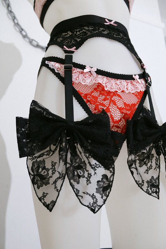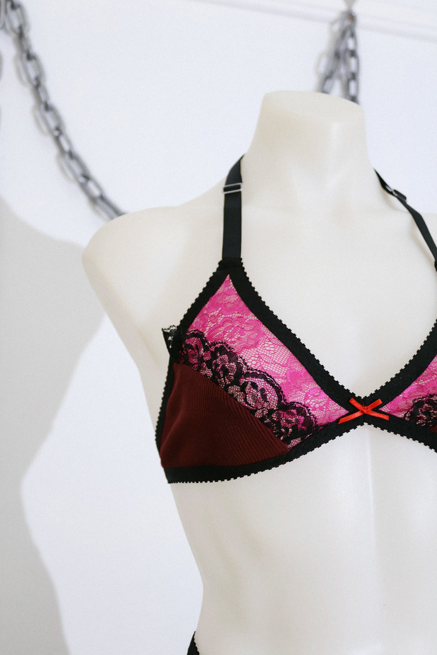 A limited edition Daphnis Bralette in cotton rib and pink lace with contrasting black trim. Featuring adjustable soft satin straps and a red bow. A very limited edition piece.