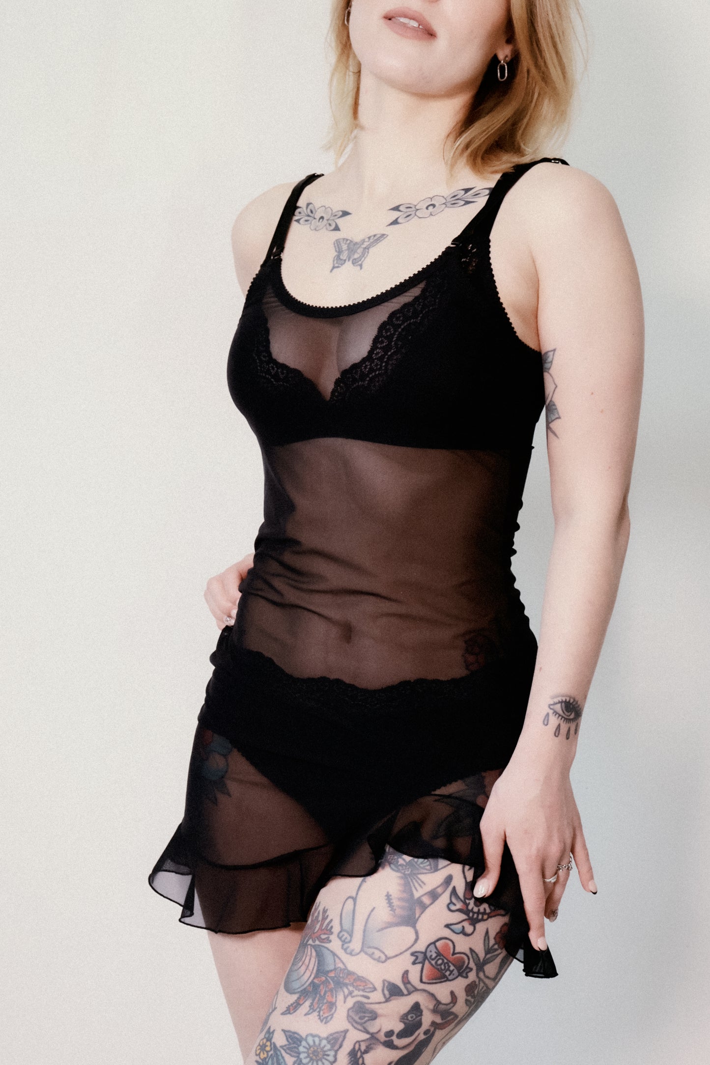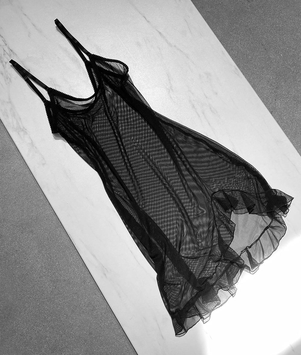 A sheer nightie cut from soft and stretchy ltalian mesh fabric. Featuring a romantic frill at the hem and adjustable satin elastic straps.
