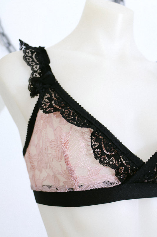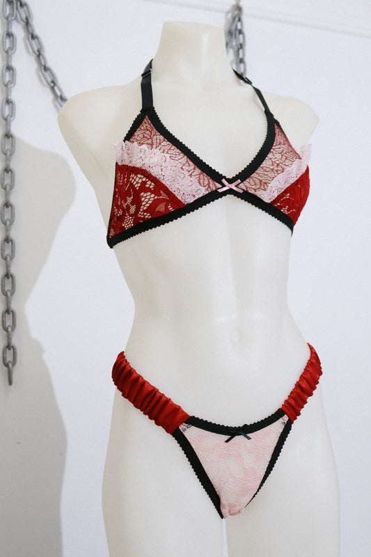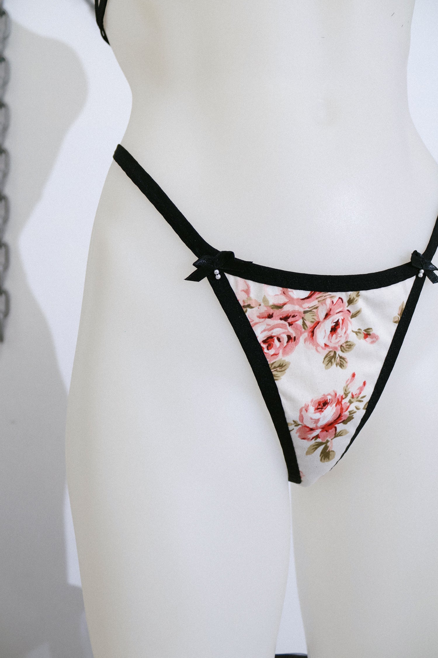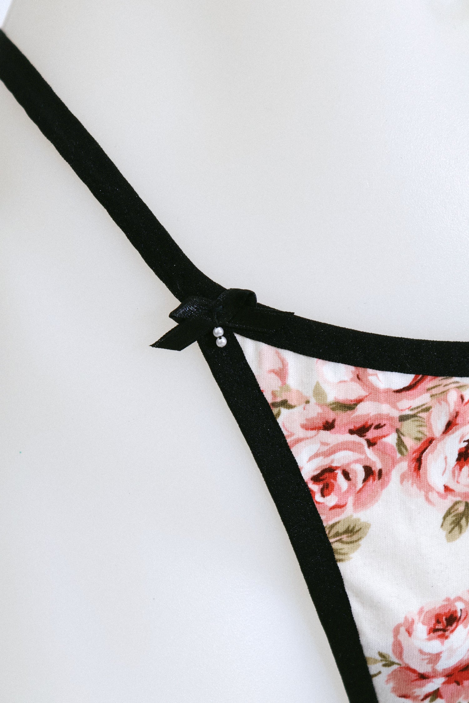 A romantic tiny thong in cream and pink floral organic cotton jersey. Made to wear high on the hips and featuring contrast trim. A very limited edition piece.