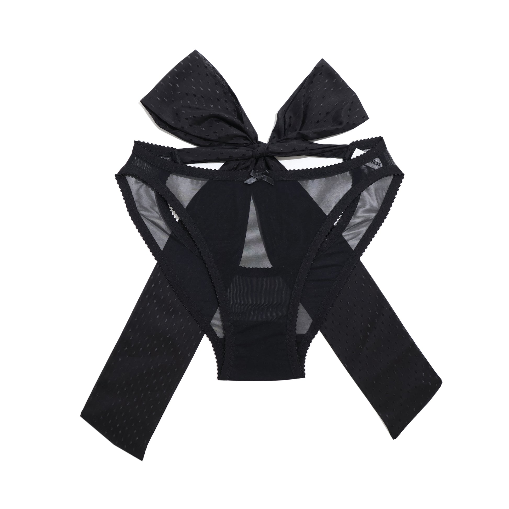 A new interpretation of one of our earliest designs. The Mindy Knickers feature a peephole back with a dramatic silk bow. The main body is cut from sheer and stretchy black mesh and the ties are cut from a lightweight deadstock cotton silk.