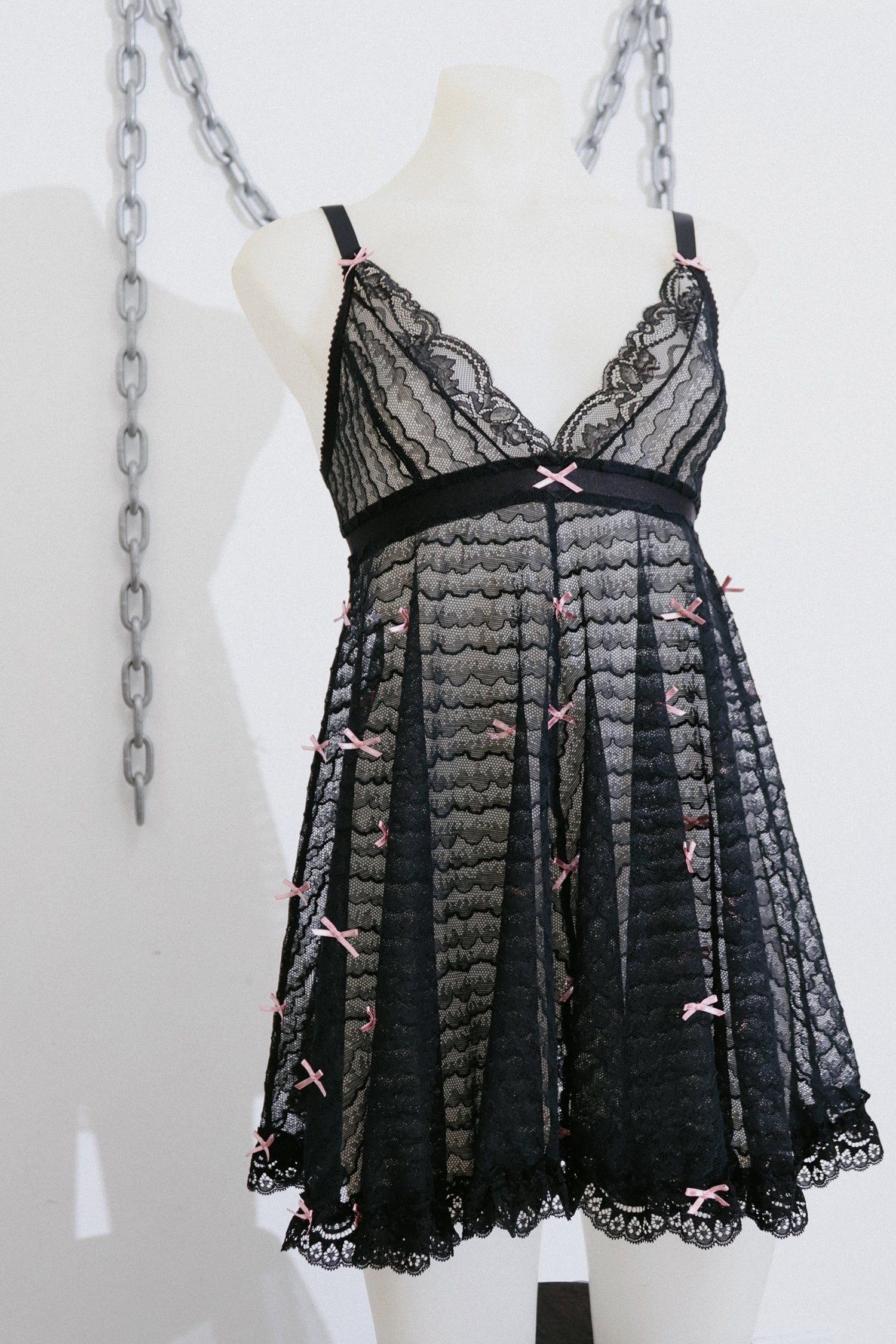 A sweet and romantic babydoll in black lace and decorated with pink bows. The bust features complimentary lace trim and the skirt is finished with lace ruffles. A very limited edition piece, only 5 available.