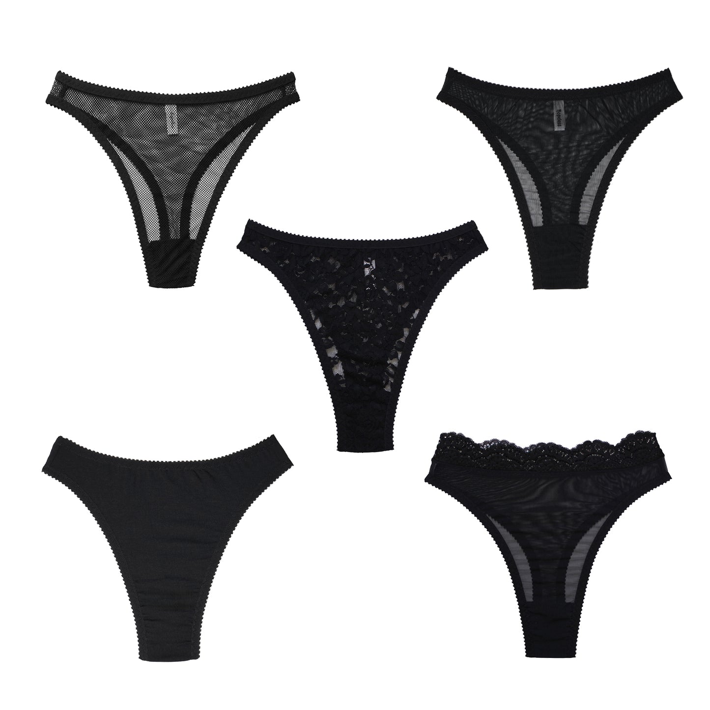 A 5 pack of our best selling Sabrina Thong, in a surprise mix of different black stretch fabrics. Trimmed with our signature gentle picot elastic, in our classic high rise cut.