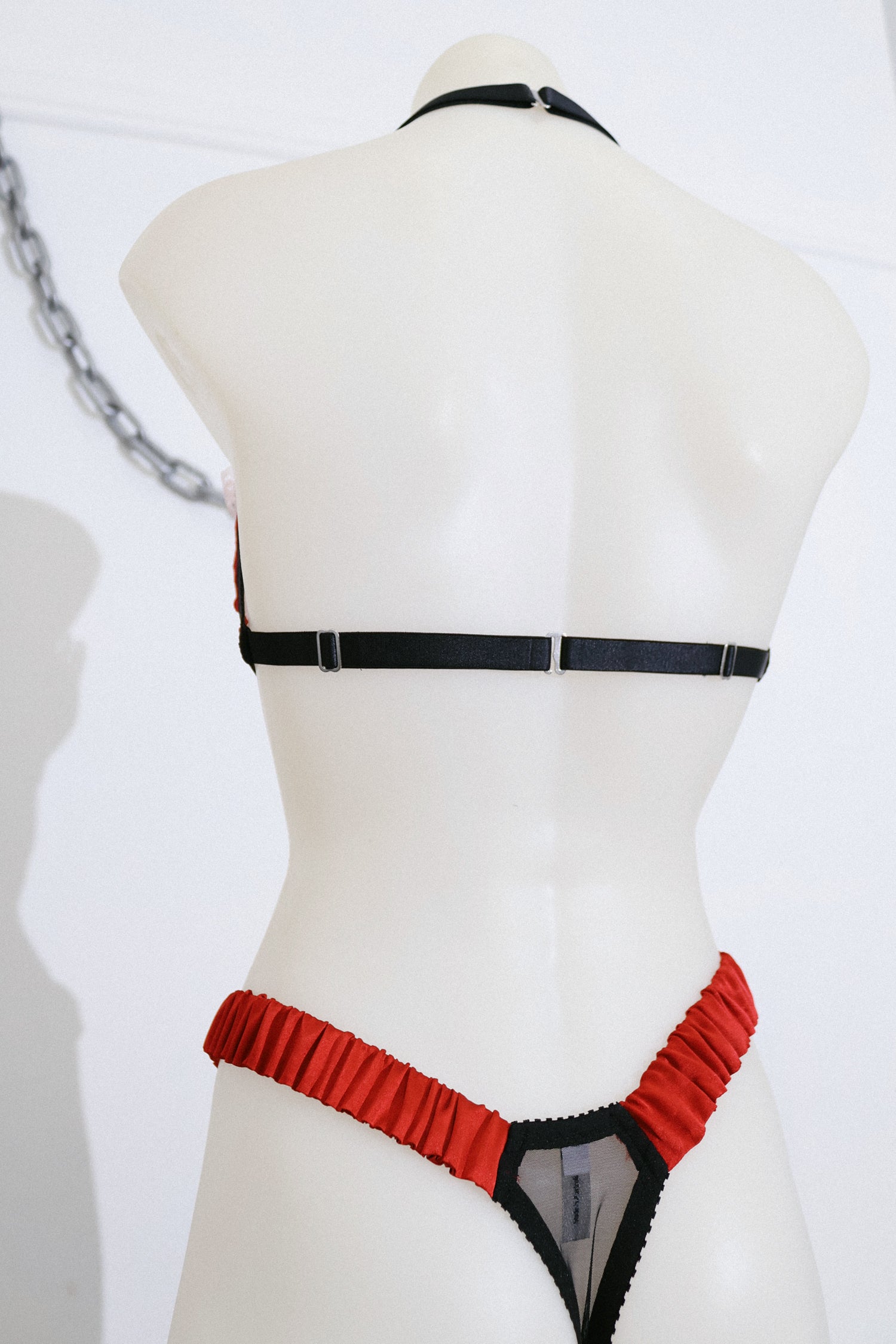 A soft and luxurious edition of our Etienne Thong with gathered silk sides. The main body is cut from delicate pink lace, and finished with contrasting black trim. Only 4 available.