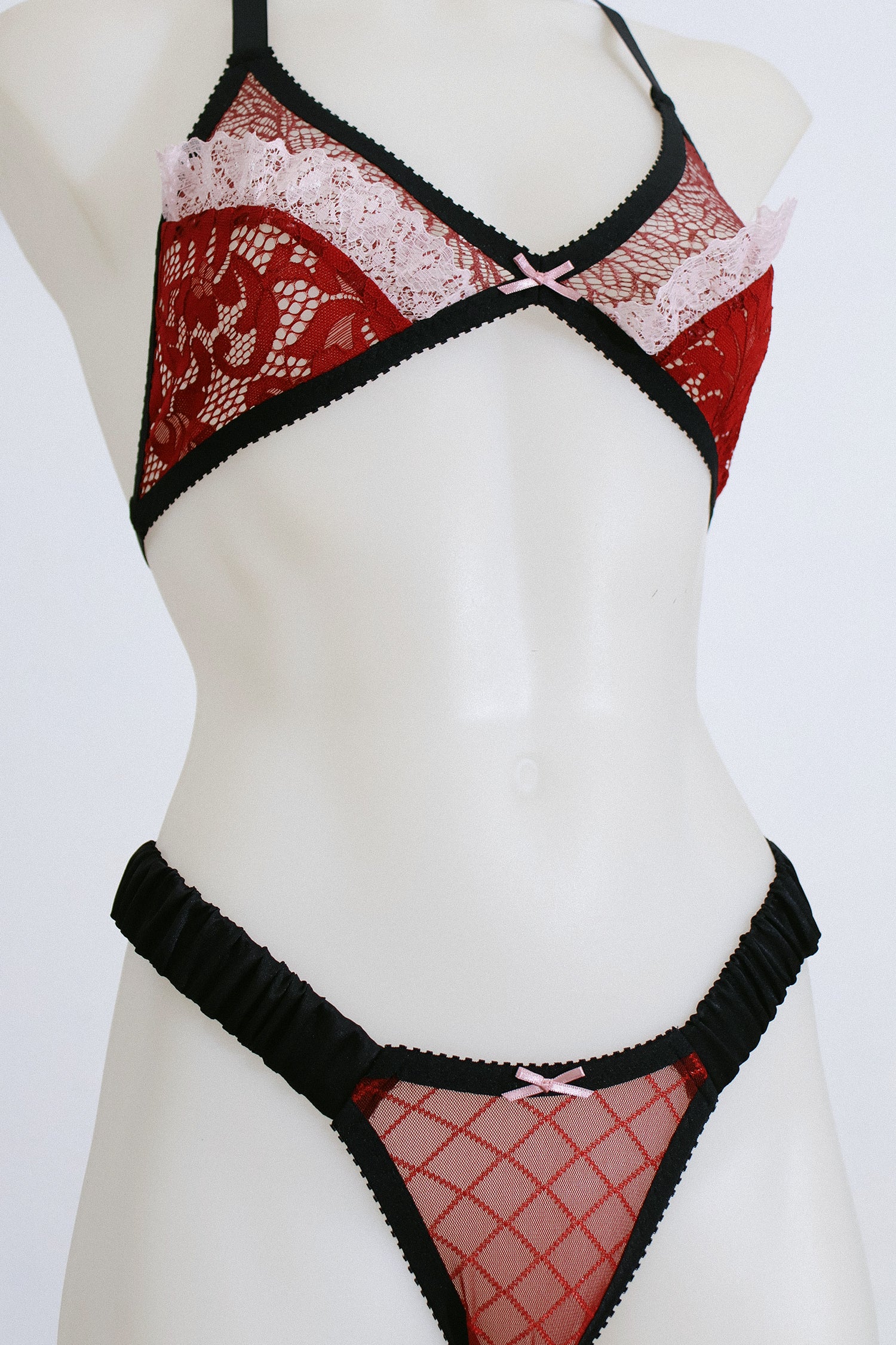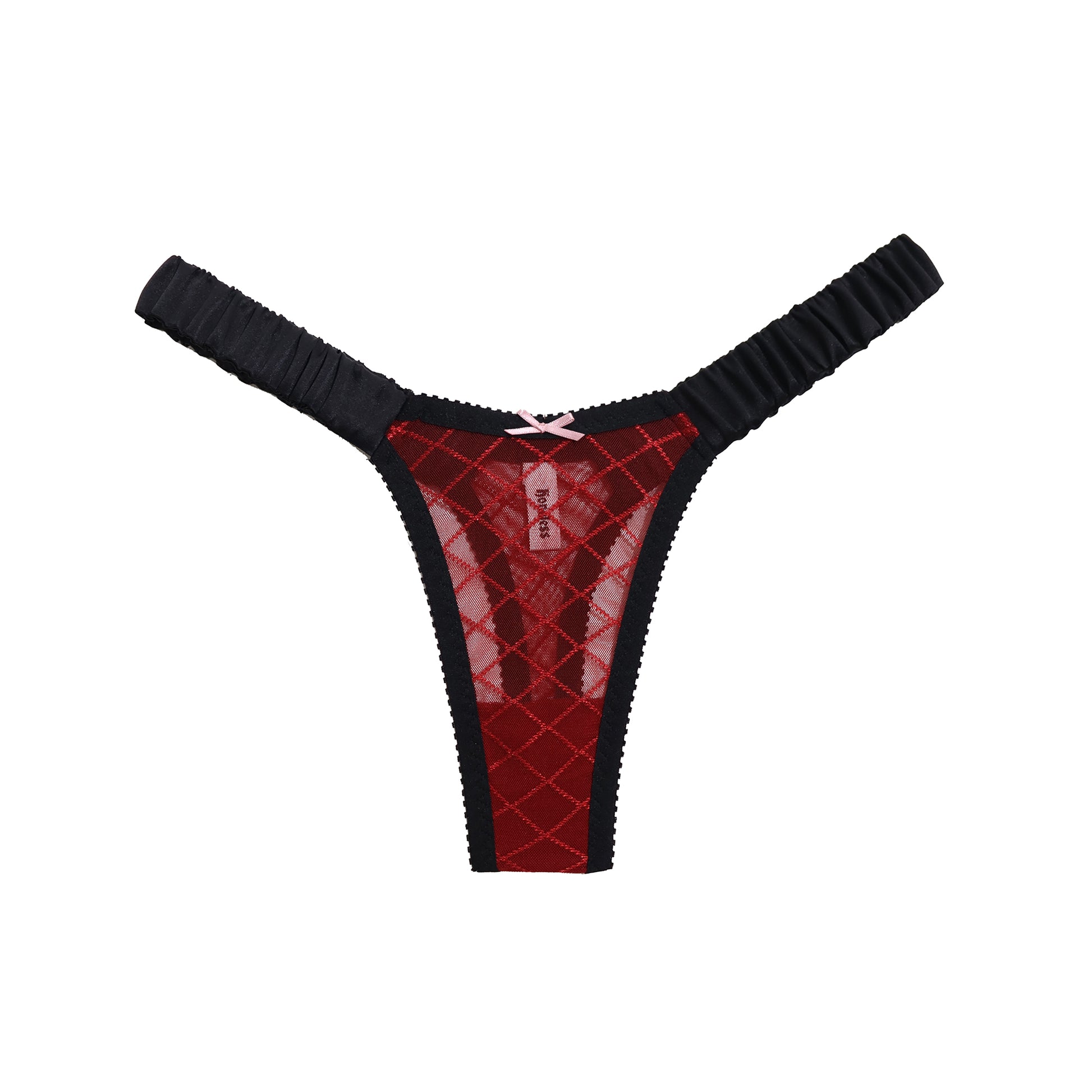 A soft and luxurious edition of our Etienne Thong with gathered silk sides. The main body is cut from sheer and stretchy dark red diamond mesh, and finished with a contrasting pink bow. Only 5 available.