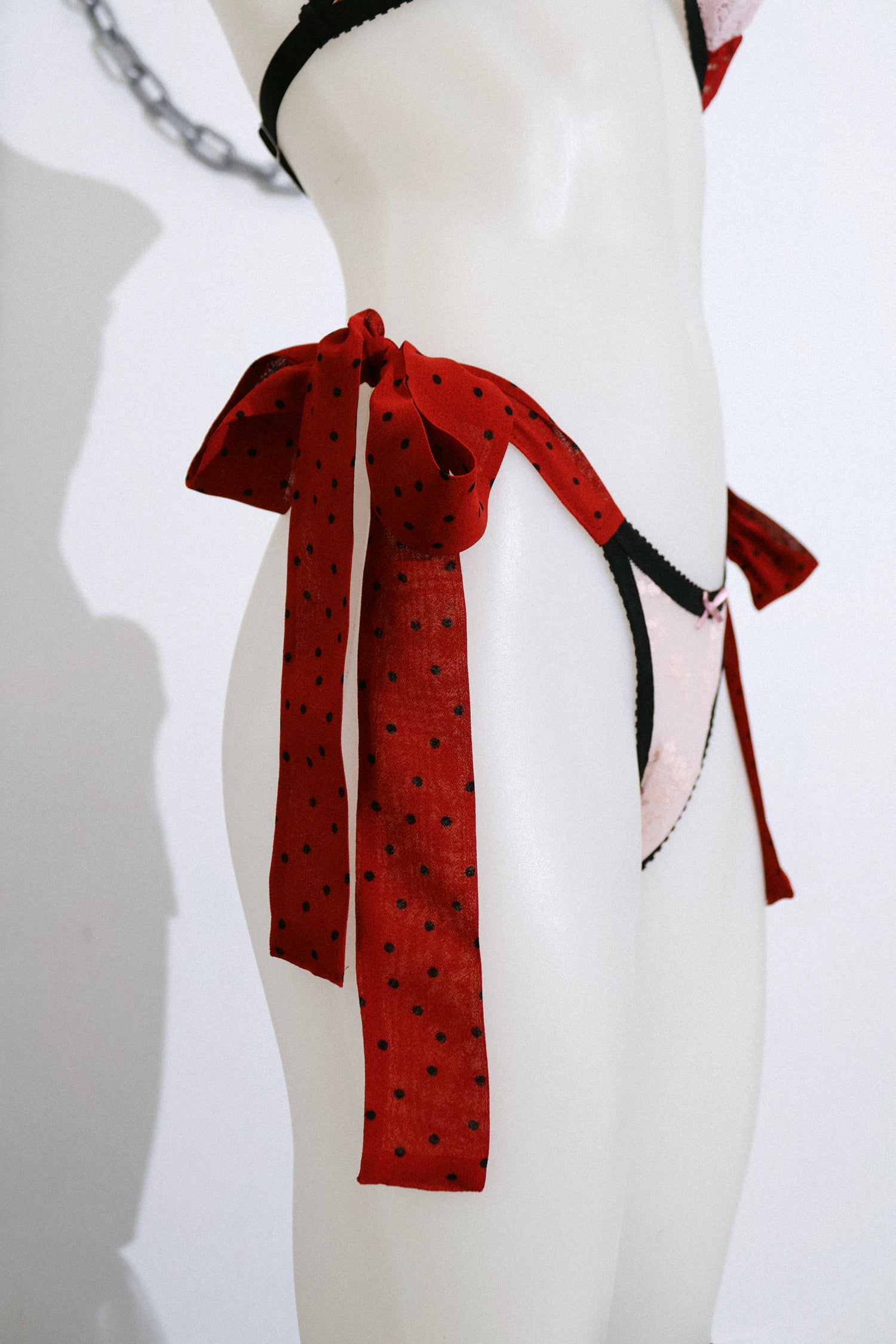 A soft and playful edition of our Etienne Thong with red polka dot tie sides. The main body is cut from sheer and stretchy pink lace mesh, and finished with contrasting black trim. A very limited edition piece.