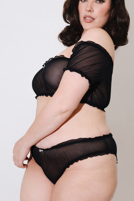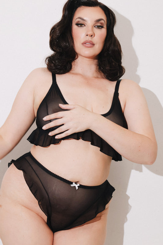 An easy to wear mini skirt in soft and stretchy black mesh with a romantic flounce at the hem. Trimmed with gentle elastic and with an optional bow.