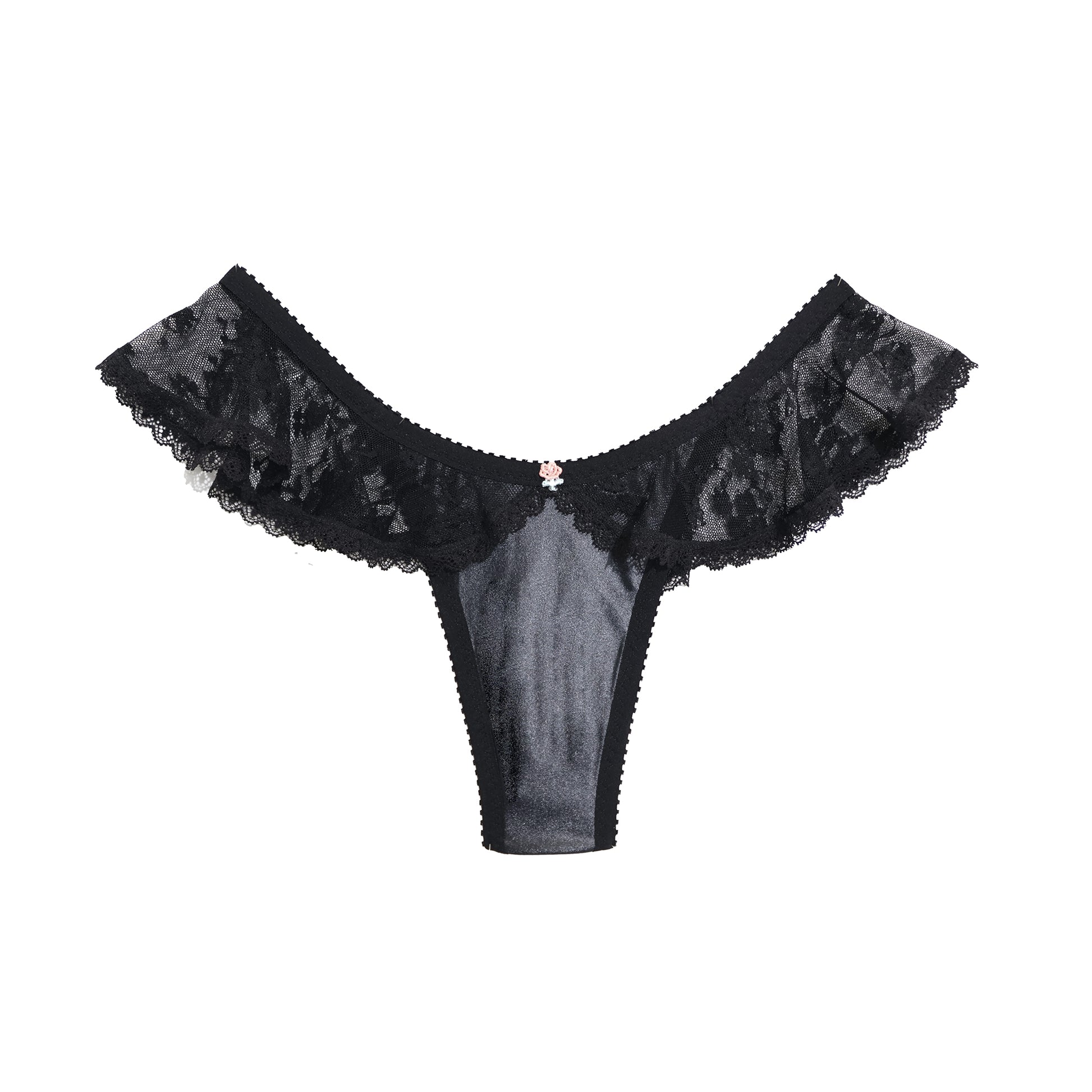 A new romantic thong made with lace frills and deadstock wetlook jersey. The delicate lace hips are trimmed with gentle lace edging, and finished with a vintage embroidered rosette at the centre front. Sewn with our signature elastic trim that is soft, stretchy and won't cut in.