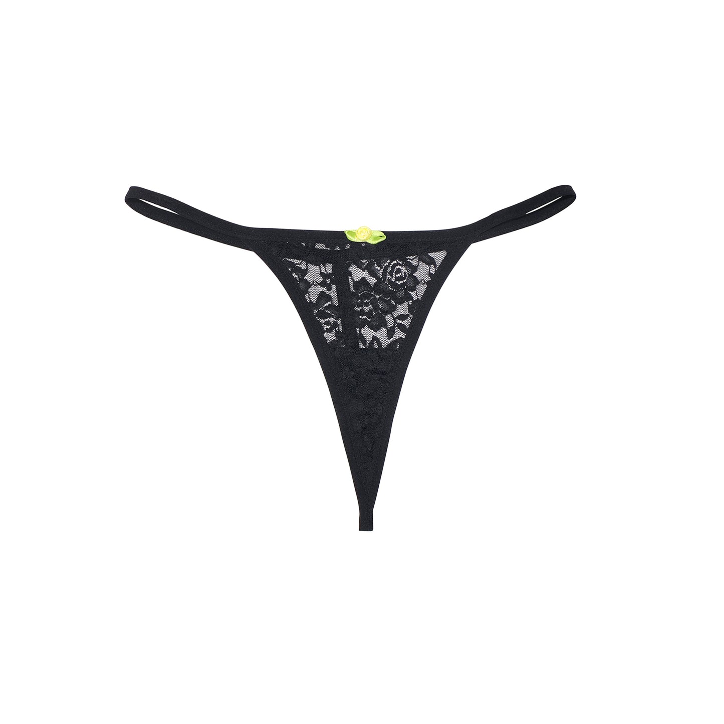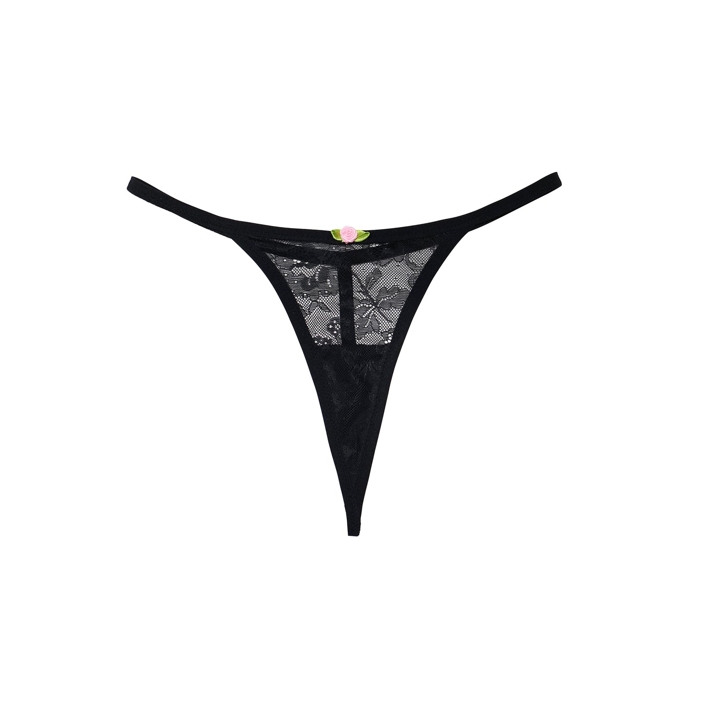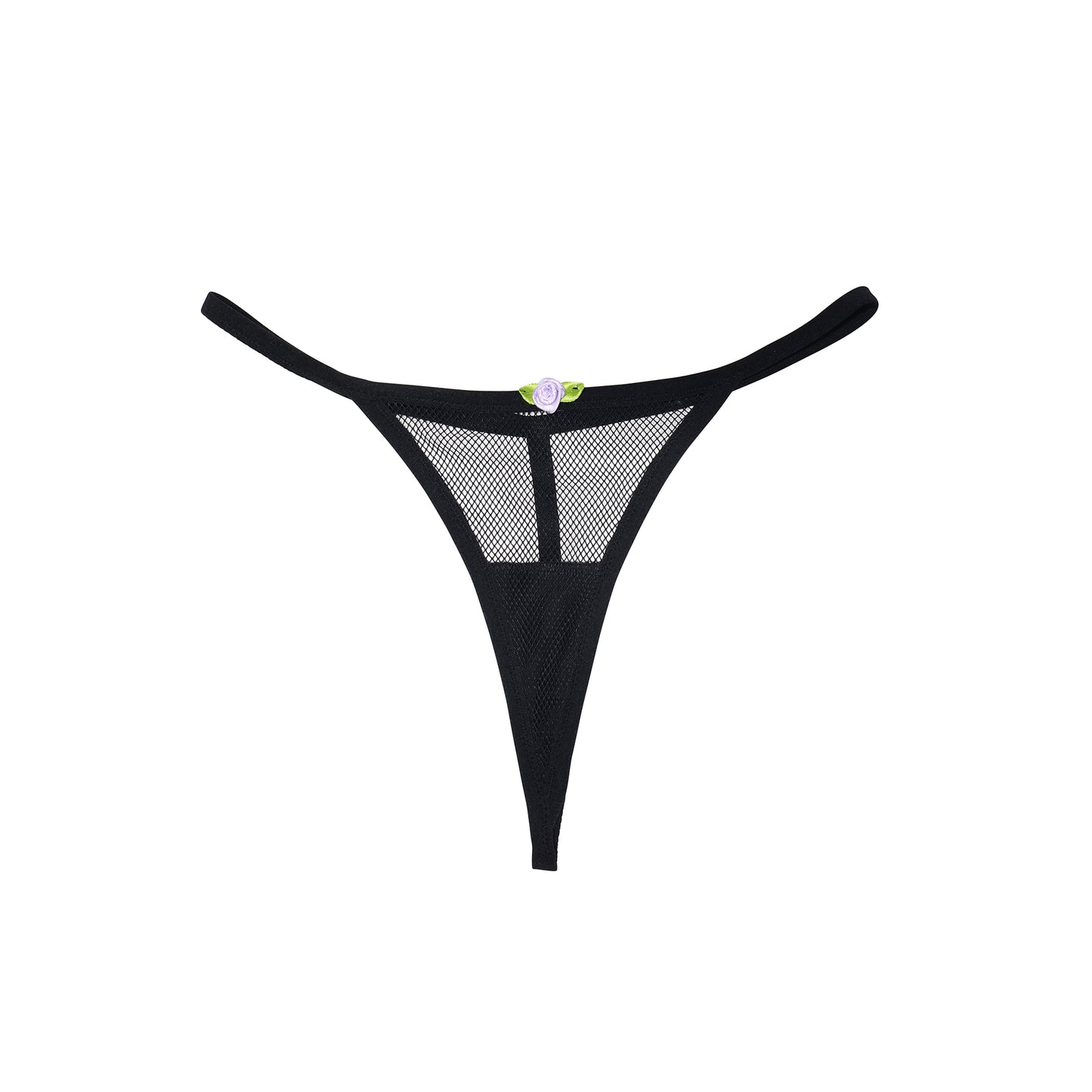 In an effort to address waste and offcuts left over from our main lines, we have created a micro thong to make use of the smallest pieces of fabric. Crafted from different mesh and stretch lace fabrics, and decorated with a vintage deadstock rosette.