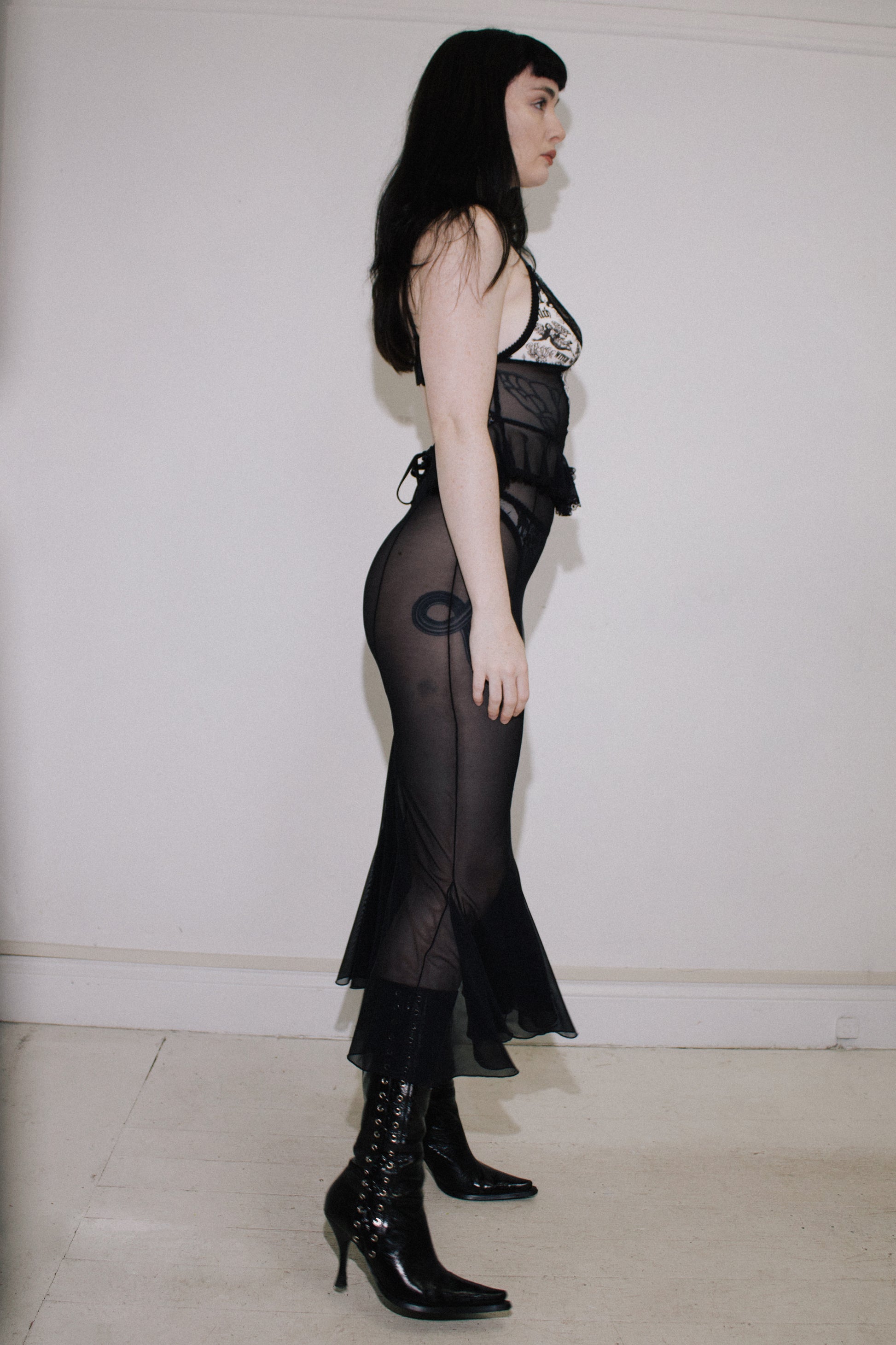 A luxurious midi length skirt made with soft Italian stretch mesh. Featuring vertical panels with flared godets at the hem. A daring look made for layering and to show off your favourite underwear.