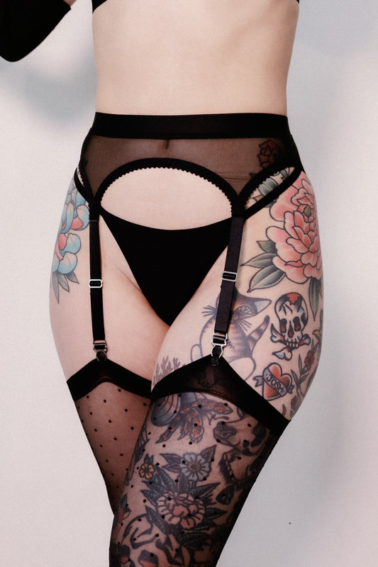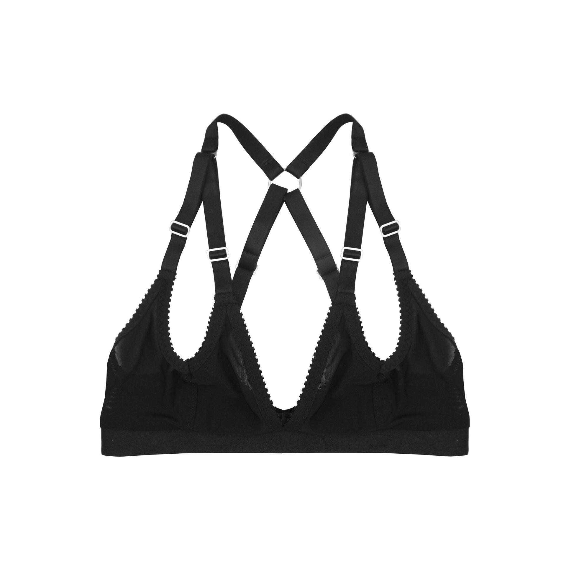 A soft and strappy bralette made from black mesh, gentle elastic trim, and featuring a double adjustable strap design.
