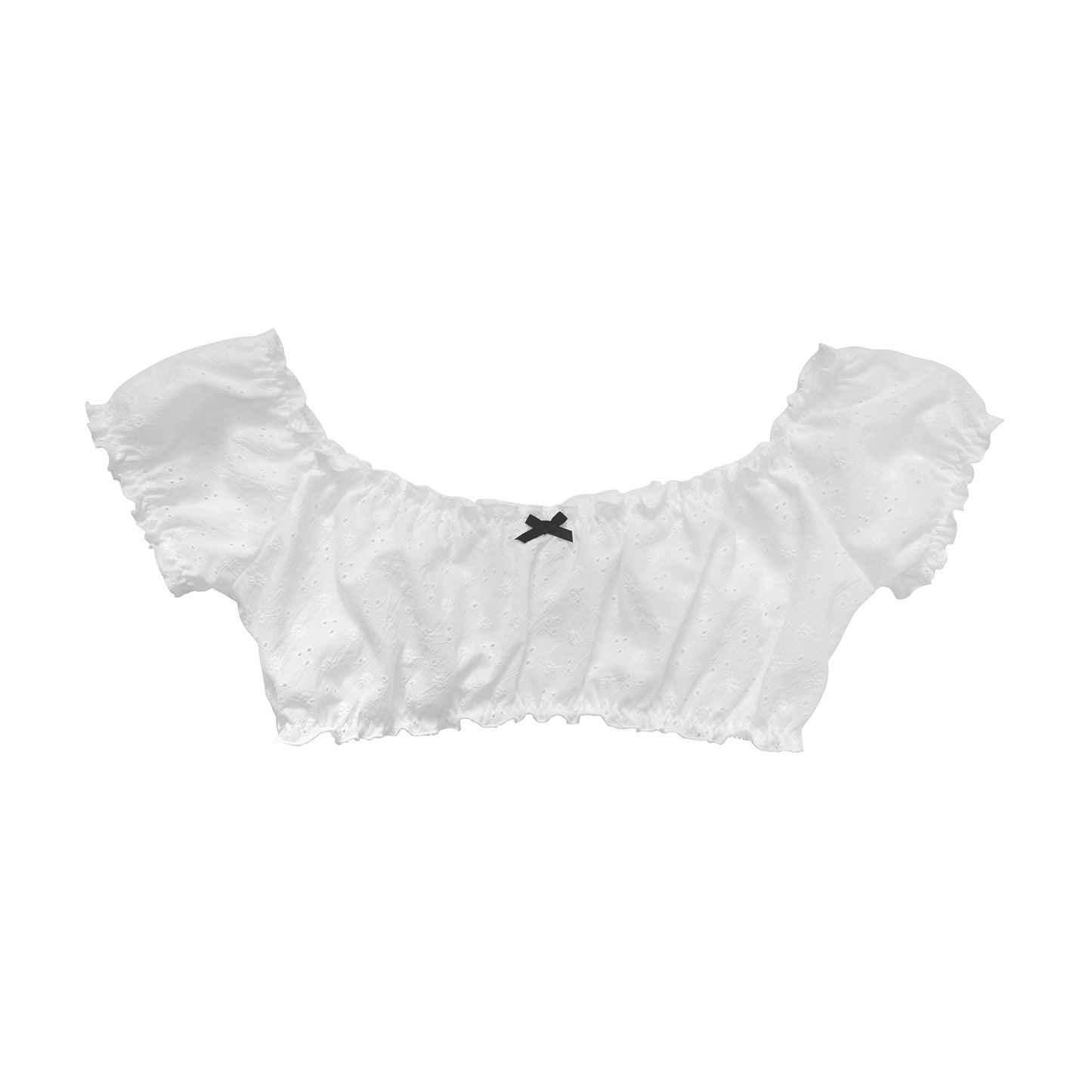 A white off the shoulder top made with bias cut organic cotton broderie anglaise. Gathered with plush back elastic and trimmed with a contrasting black bow.