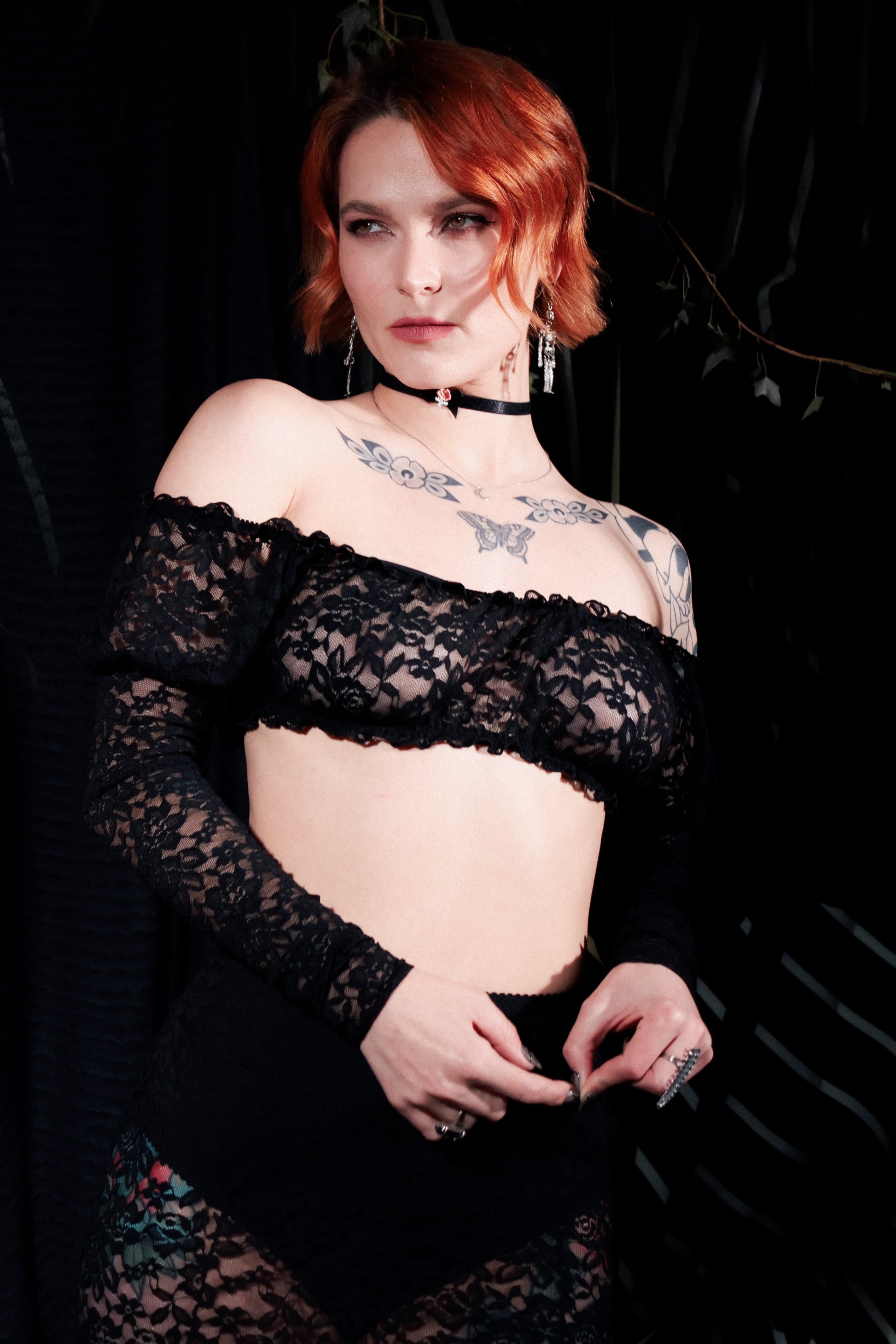 Pictured with the Morticia Skirt in matching black stretch lace
