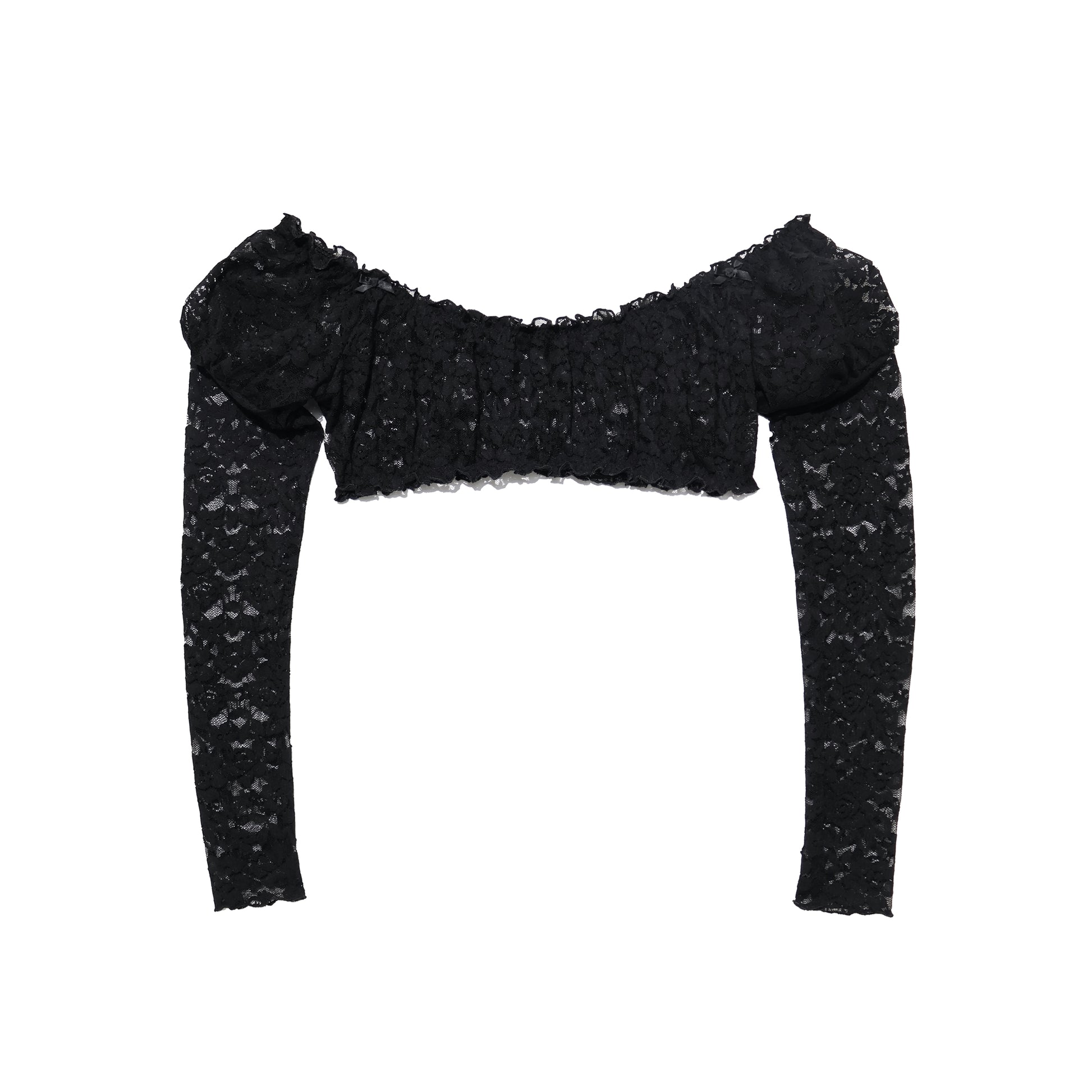 A dramatic crop top with long sleeves and a gathered puff. Can be worn higher on the shoulder or lower on the arm. Cut from soft and stretchy black lace and sewn with gentle elastic at the neckline and underbust.