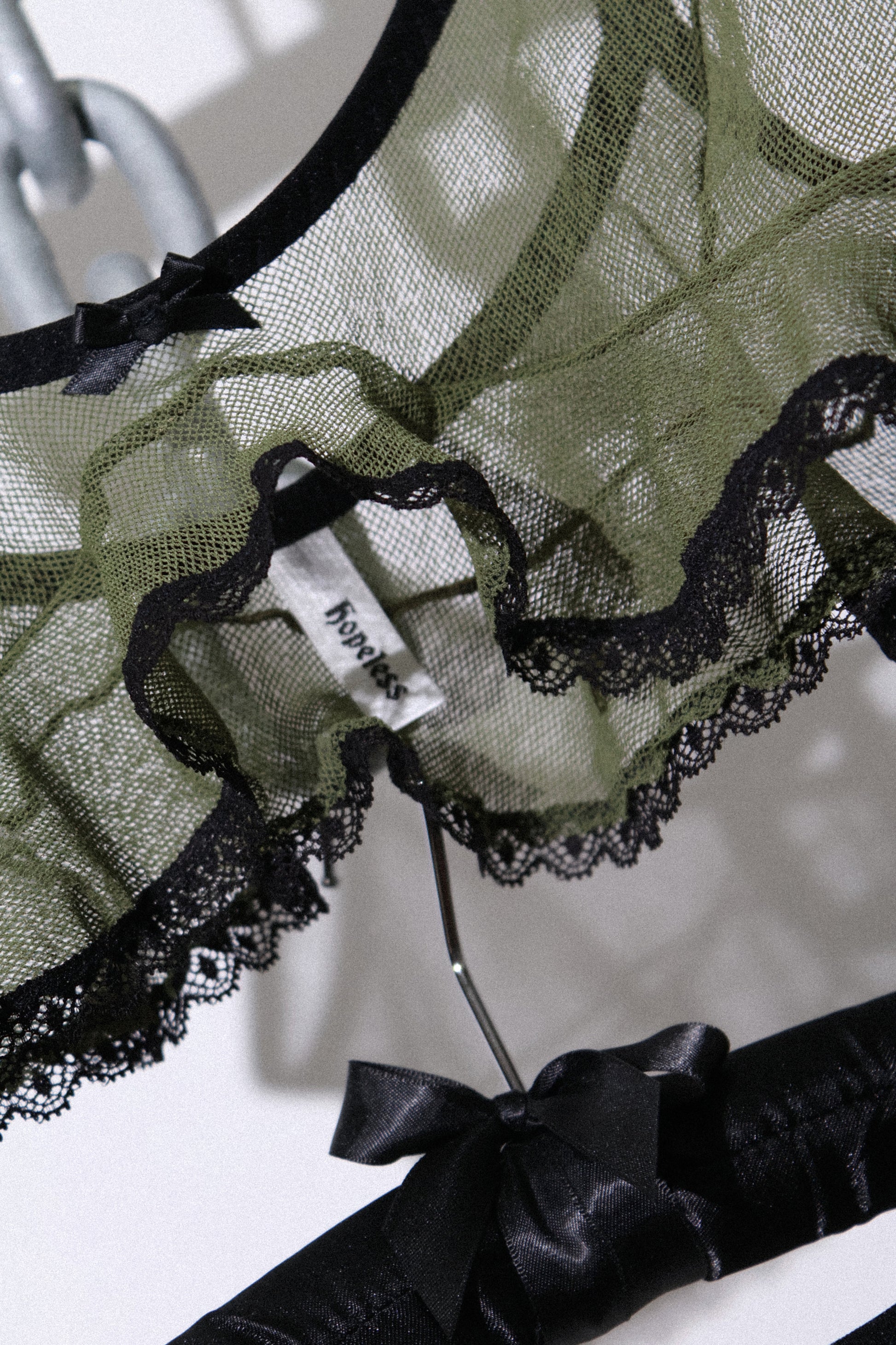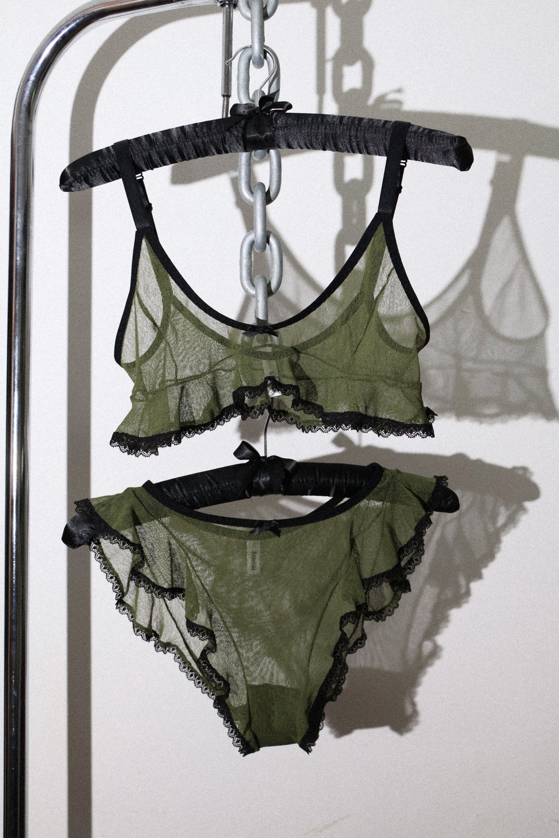 A dark green cotton mesh edition of our Mary Celeste Cami. This is a deadstock fabric that is delicate and very soft, light weight and with a matte finish. Only 4 available.