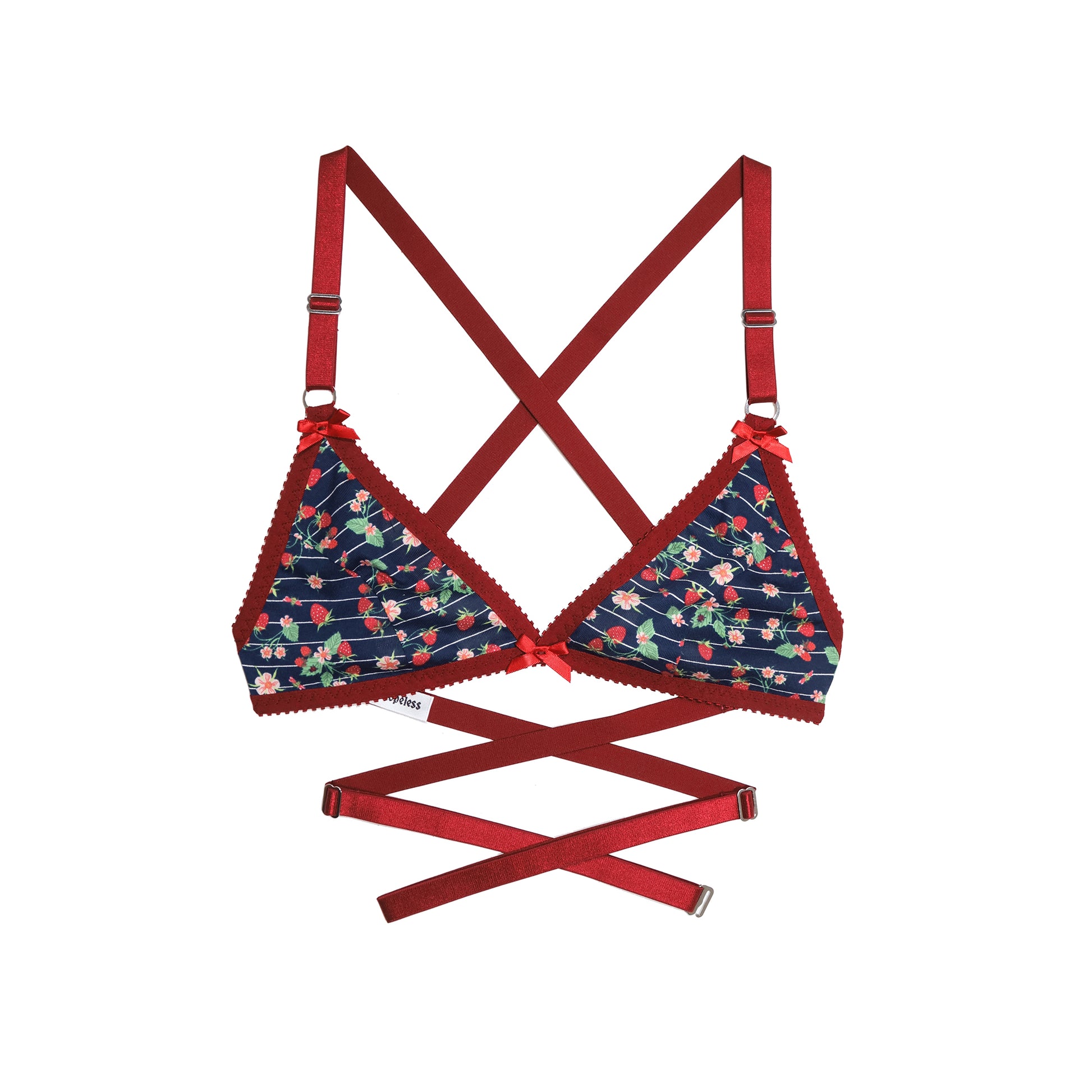 A very limited edition release of our Rosemary Bralette, made with soft strawberry print cotton jersey. Featuring adjustable straps, gentle elastic trim and finished with delicate bows.